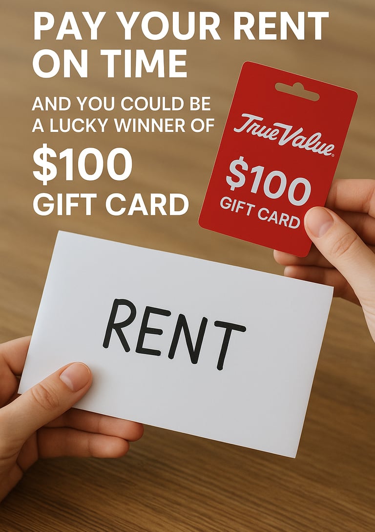 When you pay your rent on time, you’re not just staying on top of your housing — you’re also getting a chance to win! Each month, we’ll select one lucky on-time payer to receive a $100 True Value gift card. It’s our way of saying thank you for being a responsible and valued tenant.